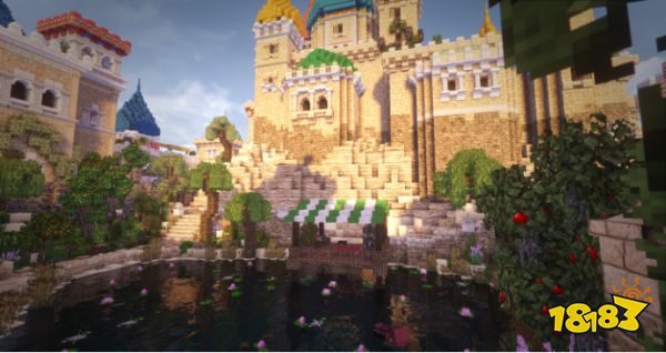 城中的水池旁边生长着红色果实的树木,而池中生长着睡莲,不知道里面会不会有鱼。
