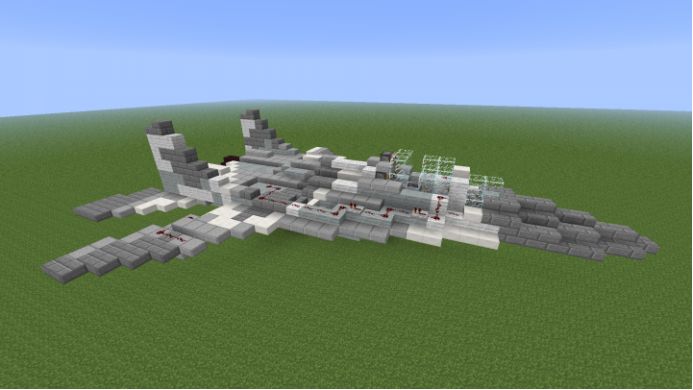 这架飞机是MIG-29支点战斗机,由灰白两色羊毛制成,据说作者改善了飞机座舱和两侧机翼,增大了人员的座舱空间,机翼两边还配有红石激活的炸弹
