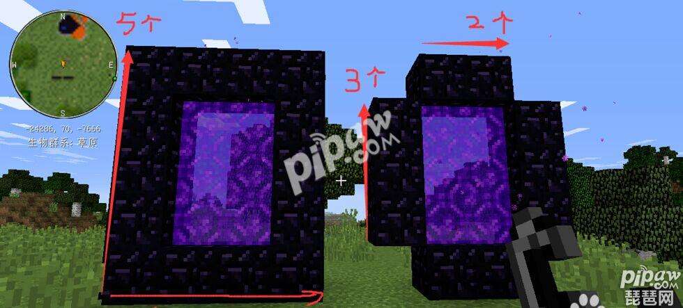 材料准备齐全下面就来做传送门了,按照图上的摆法摆好黑曜石,这就形成了一个门,之后用打火石在门框内点火,过一会就能激活传送门了,进入门过几秒就能进入地狱。