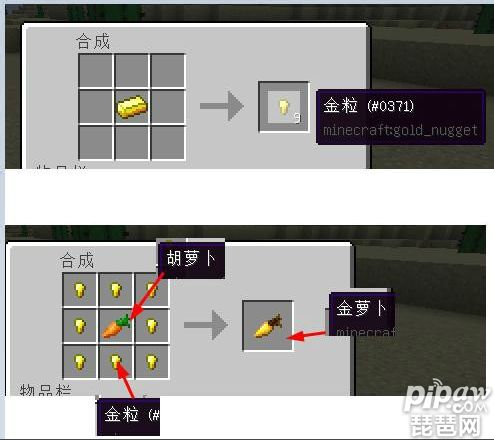 然后制作金胡萝卜,制作金胡萝卜,我们需要准备八个金粒以及一根胡萝卜,准备好后,把胡萝卜放置在工作台正中间,然后用金粒围住胡萝卜,就能合成金胡萝卜。