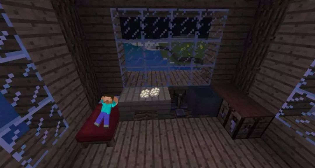 皎洁的月色透过村舍的窗扉,洒落在柔软的羊毛大床上。酿造台旁的炼药锅清水满满,旁边的木桌上还摆放着刚得的幻翼膜,刚从幻翼的袭击中逃脱出来的史蒂夫,终于回到村庄可以好好睡上一觉!