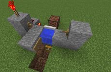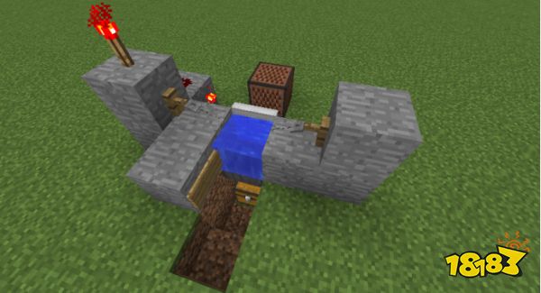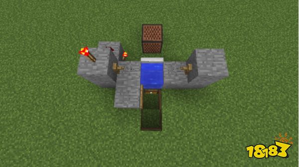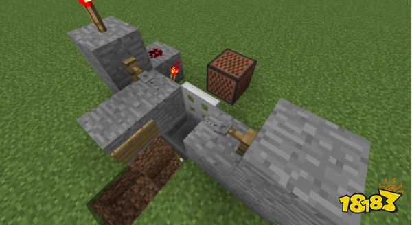 所需材料:8个石头(可替换成任意可放置红石的方块)、1个音符盒、1个水桶、1个红石、2个红石火把、2个绊线钩、1个告示牌、1个漏斗、1个箱子、1根线、1个铁活板门