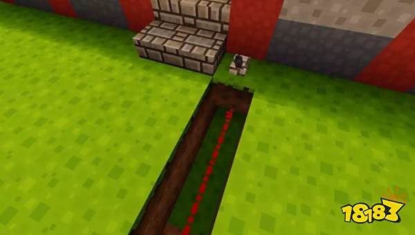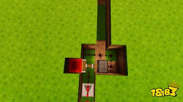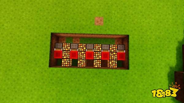 4、在粘性活塞的后面放上红石线,这样就将所有的活塞连接起来了。在最中间的位置向下再挖两格,放上红石中继器。将中继器的信号强度往后调2格。