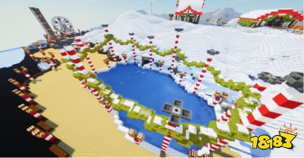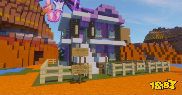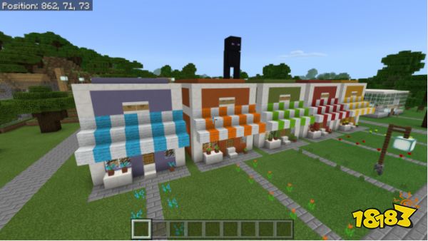 除了上面两栋制作精巧的房子,这种随处可见的小商店也十分可爱,五种颜色的商店排成一排,而在商店背后的末影人就是最可靠的“保安”,毕竟没人能从末影人手里抢走一个草方块。