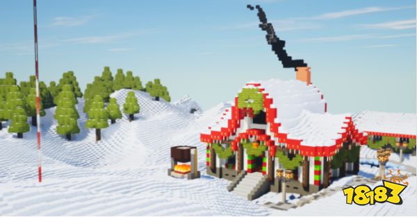 在皑皑白雪中一座温馨可爱的小房子坐落在一片小小的森林旁边,从房子烟囱中中冒出的烟火非但没有破坏明亮的画面,反而是给冰冷的冬天增添了不少生活的气息。