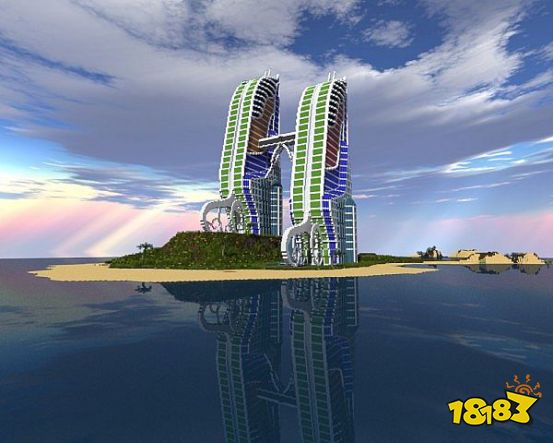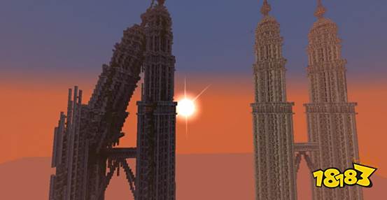 而在看到这两座大厦的远景之后,小编只想问这个天空背景的材质包是哪位大神做的?晚霞可太漂亮了。