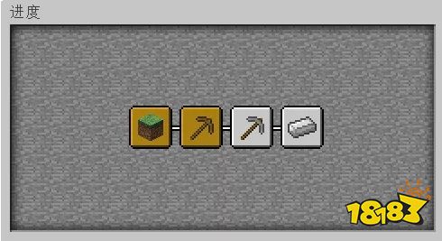 第一个起始进度的第一个下游进度叫做“石器时代”,图标是木镐,不管是通过尝试还是误打误撞我们应该可以可以得知它的要求是使用木镐挖掘原石并采集一块圆石。