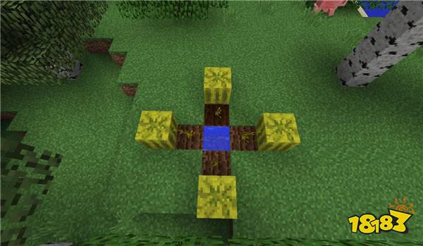 如图所示,这是一种错误的种植示范,这种种植方式只有最外层并且与泥土方块没有高度差的瓜藤才有可能结出果实。