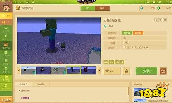 在组件中心中搜索:万能捕捉蛋,即可找到本模组。这是一个适用于1.9到1.12版本的工具型模组,可以让你的生存之旅更加方便轻松。
