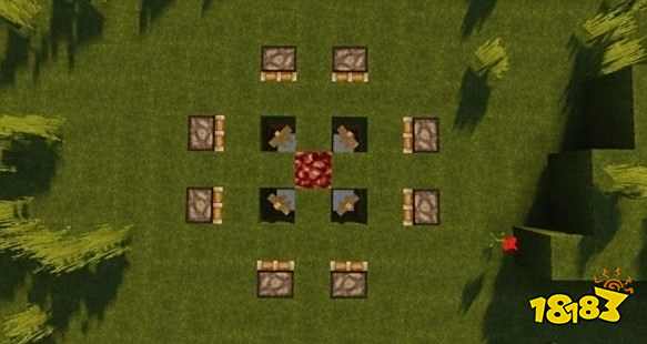 1.首先在中间放上地狱岩,对角线处往下挖两格在底下垫上活板门后,放上盔甲架。