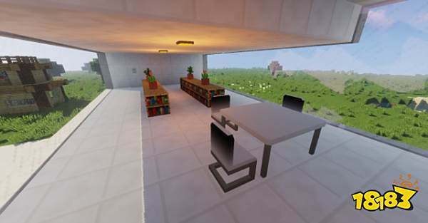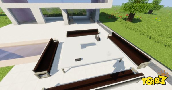 这里提醒大家一下,小怕使用了家具mod,觉地还不错的小伙伴可以去下载一个自己试试哦。泳池的旁边放上了沙发以及一个风格比较现代的桌子,桌子上放了一个闹钟、玻璃杯和一个扩音器,这些都是家具mod当中的东西!