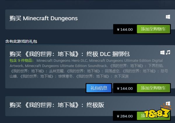 我的世界地下城分别推出了普通版、终极版、和终极DLC捆绑包,价格分别为144元、284元、144元。