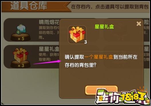 打开背包,点击左下角的【仓库】,打开仓库,点击【星星礼盒】,会有如下图的提示,点击【提取】,这样就可以把星星礼盒取出放在背包里,就可以使用啦。