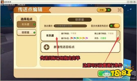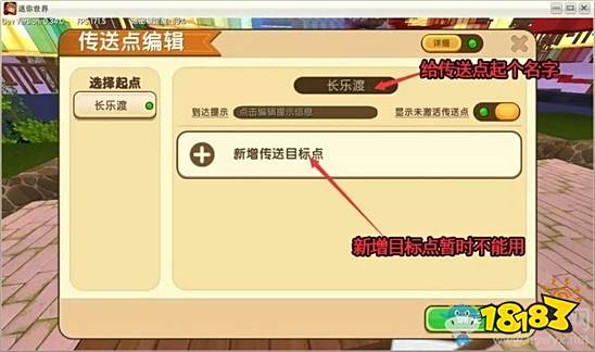 点击一下核心方块,出现这个界面,我们就给这个传送点命名为地图的名字好啦,叫做“长乐渡”。 下方的新增传送目标点是暂时不能使用的,因为我们现在只设置了一个传送点,传送点的起点和终点不能是一个传送点。