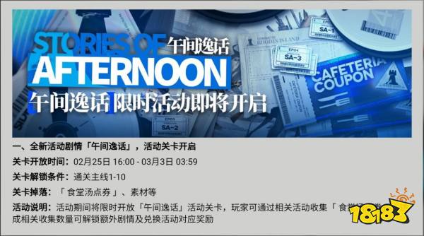 全新活动剧情「午间逸话」,活动关卡开启关卡开放时间:02月25日 16:00 - 03月3日 03:59
