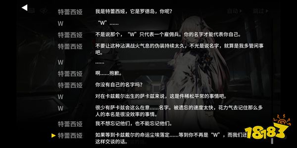 特蕾西娅:“如果等到卡兹戴尔的命运尘埃落定……等到你不再是“W”,而我们还有机会这样交谈的话,说不定你可以拥有一个更好的名字,更适合你这样的萨卡兹女性,就像罗德岛一样,如果有个名字的话,听上去就温暖多了吧?”