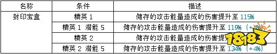 封印宝盒这一天赋是机制比较简单的伤害加成,在本身伤害非常高的情况下是非常强力的提升。但由于是对特性中储存能量的提升,比较受到关卡敌人数量以及波次的限制,爱丽丝必须自己想办法,结合敌人、利用技能多多蓄力。