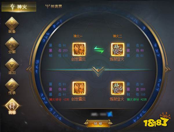 (2)只能成功转移神火副属性,且传承后副属性颜色标识不会发生变化,与原有神火的副属性颜色标识保持一致;