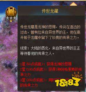 最简单的办法莫过于去进入传世龙藏,不分时间,全天可以进入,获得龙神的祝福,就可以完成一个成就用来领取奖励。地点呢,就在升龙大陆的左上角,很容易找!