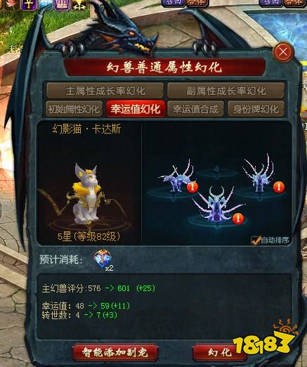 如果你不舍得,将幻兽作为幸运值幻化仪式的材料,《魔域》还为你提供了另一种提升幻兽幸运值的途径,那就是幸运值合成,不需要幻兽的牺牲,只需要使用幻魔晶石(或者幻魔之心)就可以为幻兽带来幸运的成长。