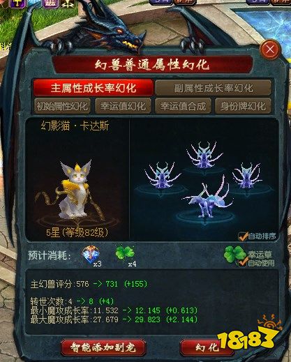 主属性幻化是拿两只符合条件幻兽进行幻化。幻化成功的话,副幻兽消失,主幻兽的主属性成长率将会得到一定的提高(如果想要让主幻兽主属性获得最大的提升,可以使用幻化幸运草)。幻化结束后主幻兽将回到1级,开始再次经历战斗考验。