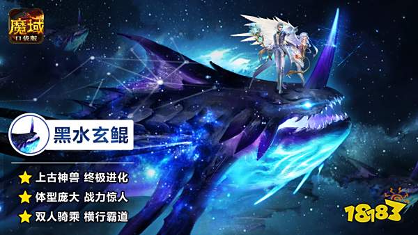 目前游戏中鲲的最强进化形态为“黑水玄鲲”,作为鲲族的始祖,“黑水玄鲲”不但体积惊人,而且辨识度极高。玩家将“北冥巨鲲”或“怒海蓝鲲”吞噬至50星,并使用“超能进化精华”就能将鲲进化为“黑水玄鲲”,值得注意的是,使用“异兽进化精华”也有一定几率将鲲进化成终极“黑水玄鲲”。强大的黑水玄鲲不但外形极其拉风外,还能提供双人骑乘功能。而“黑水玄鲲”还拥有“无尽吞噬”技能——在攻击时高几率让敌人进入麻痹状态。相信这种最原始的吞鲲乐趣,才是玩家们所想要的。