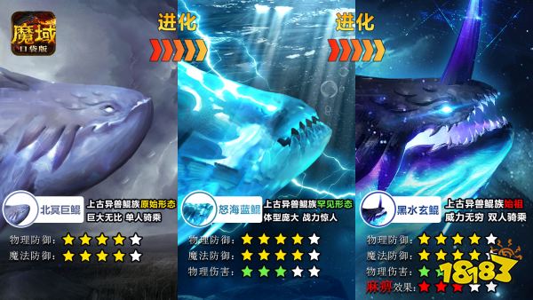 将“北冥巨鲲”培养至50星并使用“异兽进化精华”,就有很大的几率得到“北冥巨鲲”的升级版——怒海蓝鲲,这就是鲲通过吞噬进化的第二种形态。通体碧蓝的“怒海蓝鲲”不但体型增大了不少,能力也随之加强。玩家携带出战后不但能获得物防与魔防的加成,“怒海蓝鲲”还拥有“吞天噬地”技能,对敌人造成物理伤害!