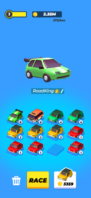 合成+赛车类似游戏,玩法即通过局外二合一合成更高级的汽车,局内利用自己合成的汽车与别人比赛。