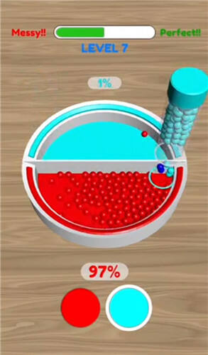 bead sort是一款非常考验玩家耐力,让大家细心进行分弹珠的魔性小游戏,各种颜色的弹珠混杂在一起,你需要将它们根据颜色的统一重新归类,相同的弹珠放置相同颜色的圆盘里,看起来就更加舒服,弹珠的颜色从两种不断的增加,你也需要更加细心。