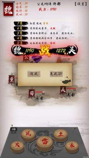 战前可排兵布阵,战中可击鼓操作。每种战鼓有独特的效果,比如“风”可以让攻击最高的武将连续攻击两次;“火”可以让血量最低的武将发起自杀式袭击,对敌方造成5倍伤害……巧妙运用战鼓可在逆局中翻盘,需要你用心领悟。