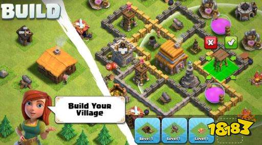 玩家一开始会获得一座建筑工人小屋及各一座等级1的大本营、金矿、兵营以及各750点的金币和圣水,第一次进入游戏会进入引导模式让玩家了解此游戏的建造、升级、提速及解锁的方式。