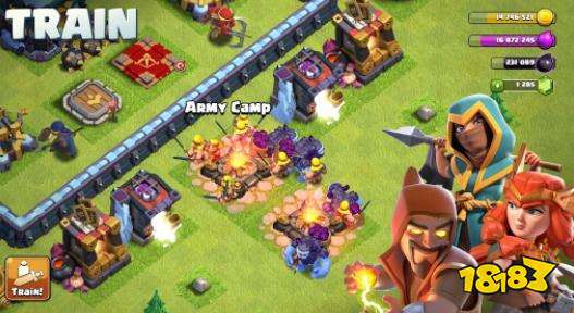 透过训练营及暗黑训练营,可以训练19种不同兵种。还可以兴建3座英雄地基,英雄都拥有技能。训练完成的士兵,将会进驻城内不同的兵营。玩家也可透过研究室来升级兵种,以提高军队的实力。玩家还可以利用法术炼炉来制造法术,以辅助战斗。玩家建筑自己的村庄时,需要考虑排兵布阵,将城墙、炮塔等建筑组织好,用以防御来敌。进攻时,是将自己训练的士兵投放到对方的地图,此时,需要灵活的根据自己训练的兵种选择投放地点,依靠阵型来打击对方村庄的弱点。