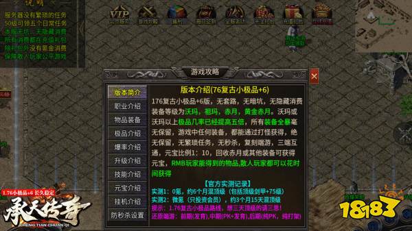 承天传奇76小极品背景176复古小极品+6版,无套路,无暗坑,无隐藏消费,装备等级为沃玛,祖玛,赤月,黄金赤月。沃玛以上极品几率已经提高五倍,装备全暴无保留,游戏中任何装备,都能通过打怪获得,绝无保留,无繁琐任务,无秒杀,复刻端游,三端互,元宝比例1:10,回收赤月或其他装备可获得元宝,RMB玩家能得到的物品,散人玩家都可以花时间获得。