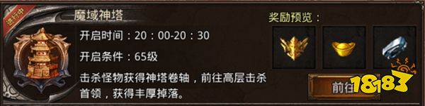 具体玩法:地图一共有14层,进入下一层需要消耗神塔卷轴,神塔卷轴可以击杀地图内刷新的怪物获得,活动每一层都有霸主,击杀后可获得丰厚的奖励。