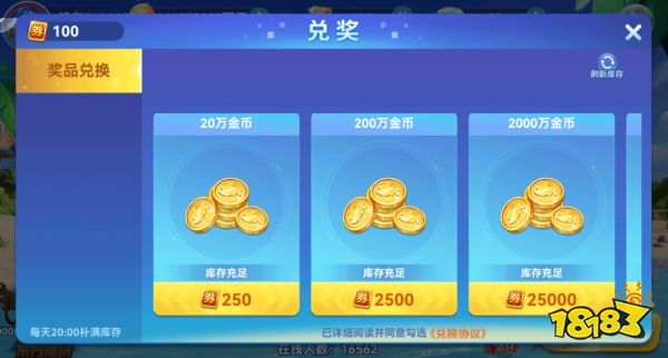 大家可以用奖券兑换金币,如250奖券可以兑换20万金币。