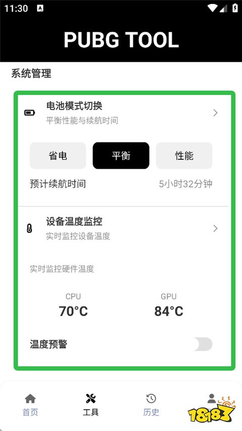5、PUBGTool和平精英画质助手还可切换电池模式以及实时监控设备温度,开启温度预警则可在设备温度过高时进行提醒。