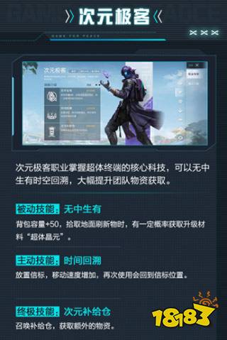 次元极客职业掌握超体终端的核心科技,可以无中生有时空回溯,大幅提升团队物资获取。