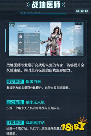 战地医师职业是研究战场恢复的专家,能够提升全队健康值,同时具有极强的自我生存能力。
