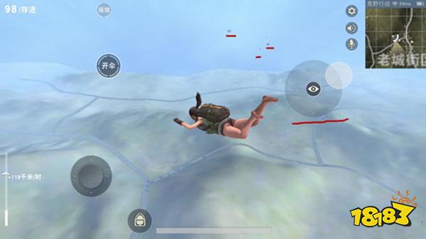 14、图中划线的都是跳伞的人,如果是组队状态下可以看到队友的名字,没有名字的都是即将战斗的对手,可以通过观察看出来人群大概的走向,在没有开伞前还可以选择远离他们,但是开伞后滑行速度会减弱,一般会落在附近,难免一战!