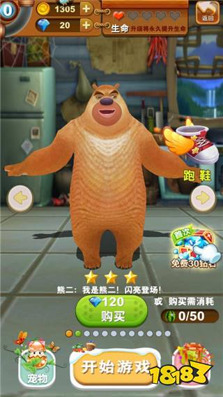 解锁条件:熊二是熊大的弟弟,需要50个西瓜解锁。而西瓜的获得途径是多进行游戏,在游戏中随机获得西瓜奖励。