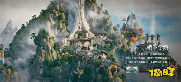 依山而建的稷下学院,以高耸入云的通天塔为视觉中心,云雾缭绕的山石间错落着飞檐翘角的中式楼阁,墙面云纹与流光机关交织,尽显 “自己告诉自己真理” 的治学气度。