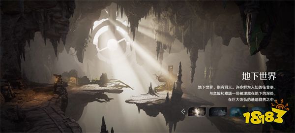 钟乳石溶洞中悬浮着石台,阳光从巨型机关天窗倾泻而下,光影交错间尽显地底世界的神秘与壮阔。