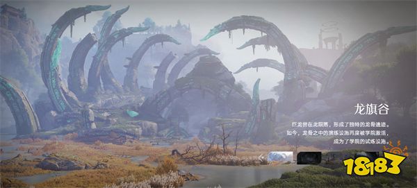 上古巨龙陨落形成的龙骨遗迹遍布峡谷,巨型骸骨带着幽绿符文,荒草与浅溪点缀其间,充满蛮荒力量感。