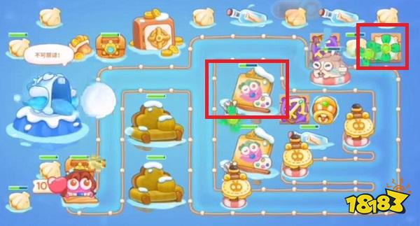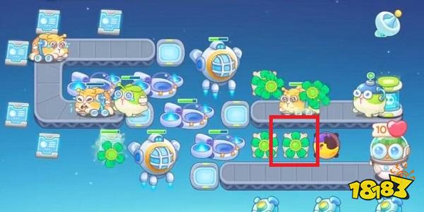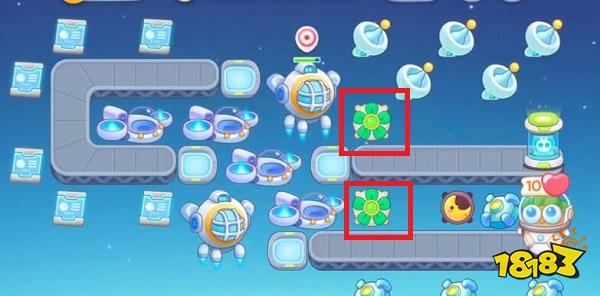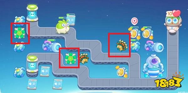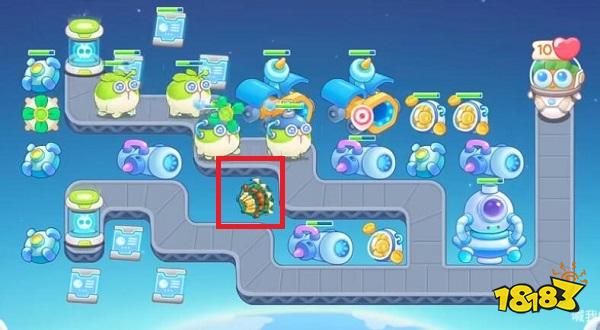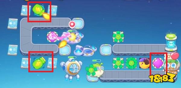 1、首先打开保卫萝卜4官方正版安卓版,我们进入关卡以后,在如图所示的红框位置放置1个分裂炮台,这样我们攻击怪的时候同时也可以攻击其他建筑物。