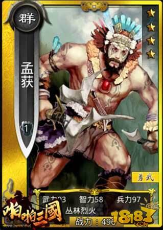 中丞孟获,群雄 骑兵 强袭勇将。专属战器:刀。被动:雄狮、持盾、会心。专属战器:百兽猎刃,强化被动:反弓。连协:诸葛亮、刘禅、祝融夫人。技能:天南蛮入侵,消耗士气4 自身周围部队武力值提高30%,持续12+12秒。并对敌方武力值最高部队造成34083的基础伤害,实际伤害受双方武力差距影响。同时自身召唤冲车作战,最多存活15秒,冲车不会回血。