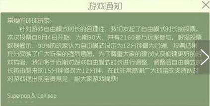 从结果来看,可以看出来玩家们对于调整时间的强烈意愿,所以球球为了尊重大部分玩家的选择,在近期将会对比赛的时间进行调整,将之前的每局15分钟缩减到每局12分钟,球宝们在不久之后就可以体验到啦。