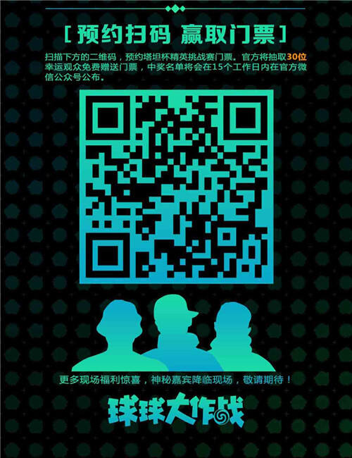 扫描下方二维码,预约2017《球球大作战》塔坦杯精英挑战赛门票,官方将抽取30位幸运玩家免费赠送门票。更多现场福利惊喜,敬请期待!