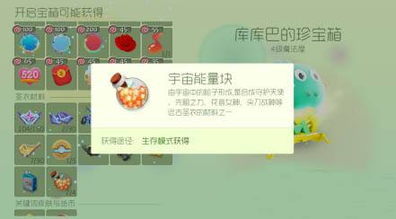 正常来说,较为稀有的东西都必须要通过至尊宝箱开出,另外的一个宝箱虽然也不错,不过小编最多只开出过一个最好的就是芝士脆角啦(然并卵,小编买了玫瑰花辣),所以想要获得宇宙能量或者是七彩粘合剂的话,就要在生存模式里多练练啦,或者可以让你的大神朋友们带你飞!