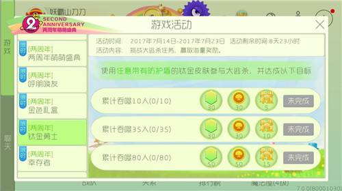 累计吞噬35人,可得彩豆*30,金蘑菇*30,两周年活动集字*10;