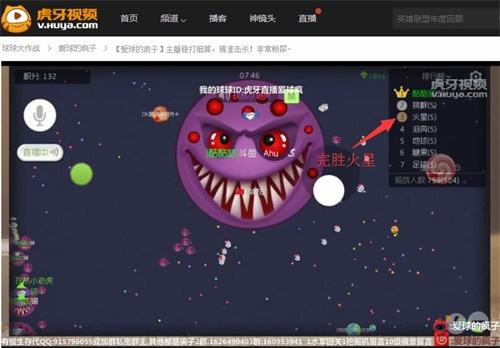 队友拿大球向前进行四分,末尾的四分之一球直接被疯子吃掉,疯子继续向前分身,吃掉前面的两个分身,留下队友顶在最前面的分身,在次向前分身冲过队友的球,开始快速的中间分球模式,合成大球秒掉火星。